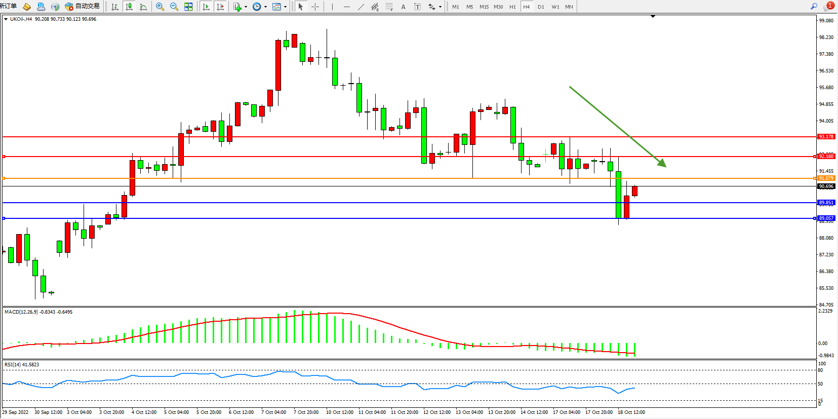 4小时图看:空头动力维持震荡缓慢下挫,短期跌势或将延续,市场空头情绪持续震荡向下移动,MACD指标处于0轴线下侧弱势整理,RSI指标处于50均衡线下侧窄幅徘徊;
