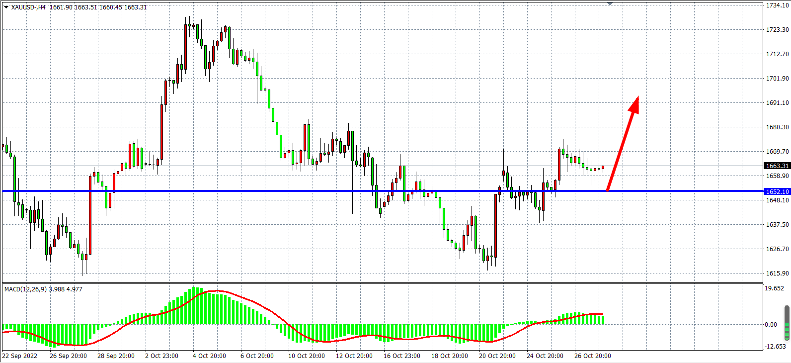 4小时图看,金价在反弹1670后出现受阻回落,支撑目前已上移1652附近,同时MACD于零轴之上维持放量状态,预示行情仍有进一步走高的可能,日内在1652之上继续看涨为主,上方目标1675-1700。