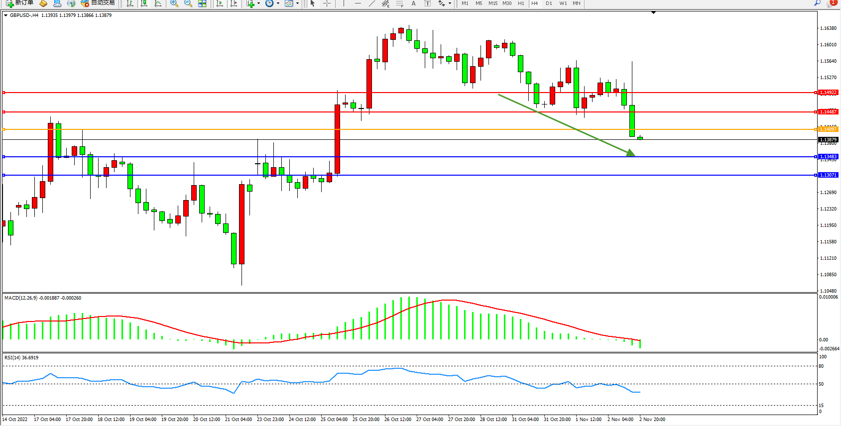 4小时图看:高位空头动力呈阶梯式震荡下行,短期跌势或将延续,MACD指标处于0轴线下侧徘徊,RSI指标处于50均衡线下侧弱势整理;