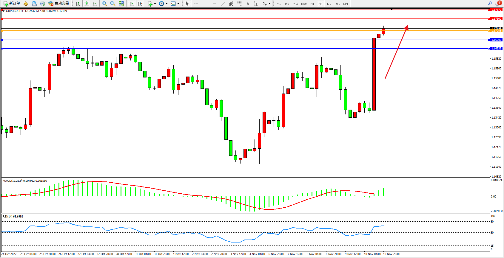 4小时图看:多头动力急速攀升,短期看涨情绪涌现,市场多头有继续向上移动态势,MACD指标处于多头区域整理上移,RSI指标处于多头区域高位平移;