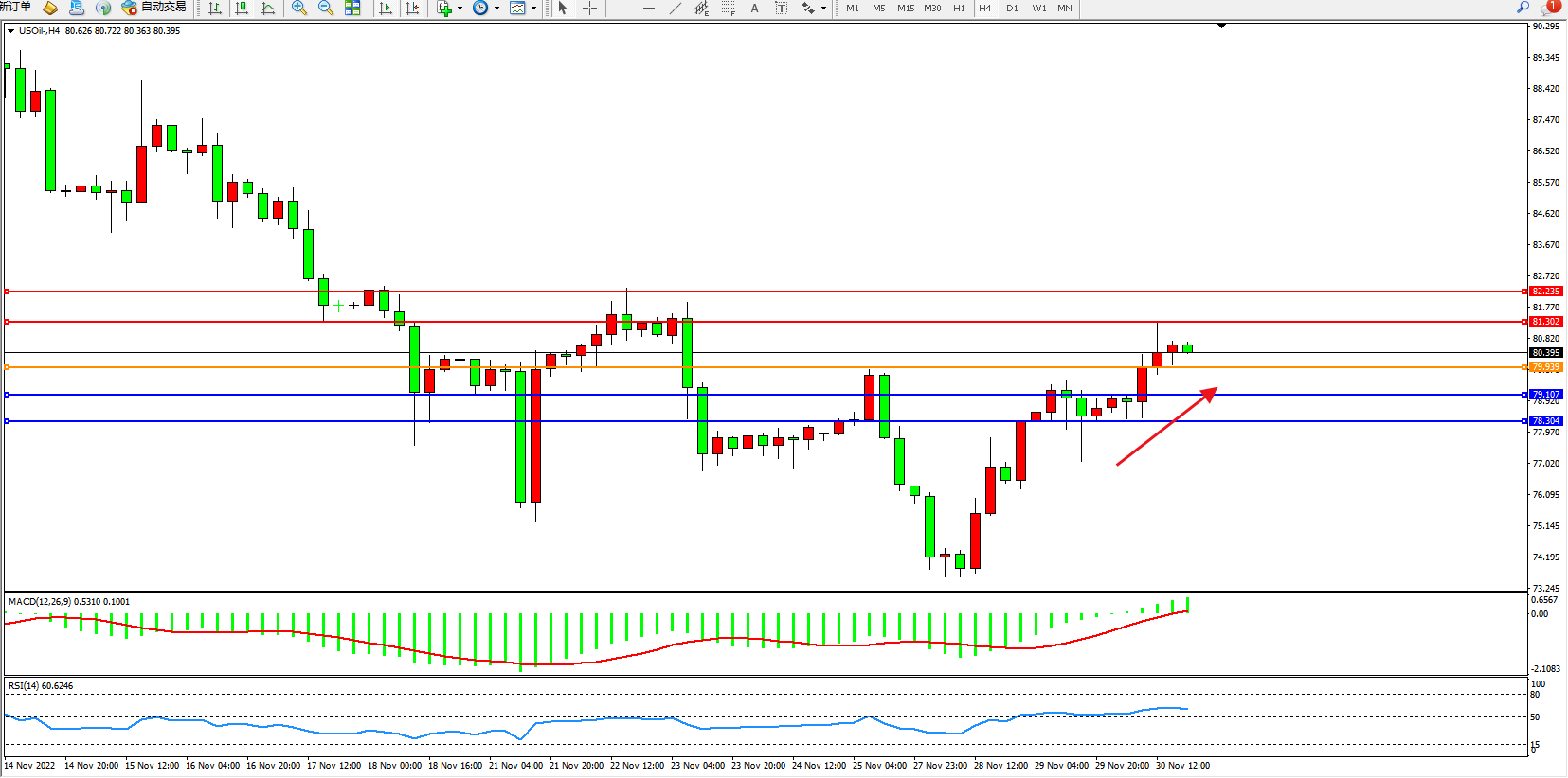 原油USOil——4小时K线图显示: