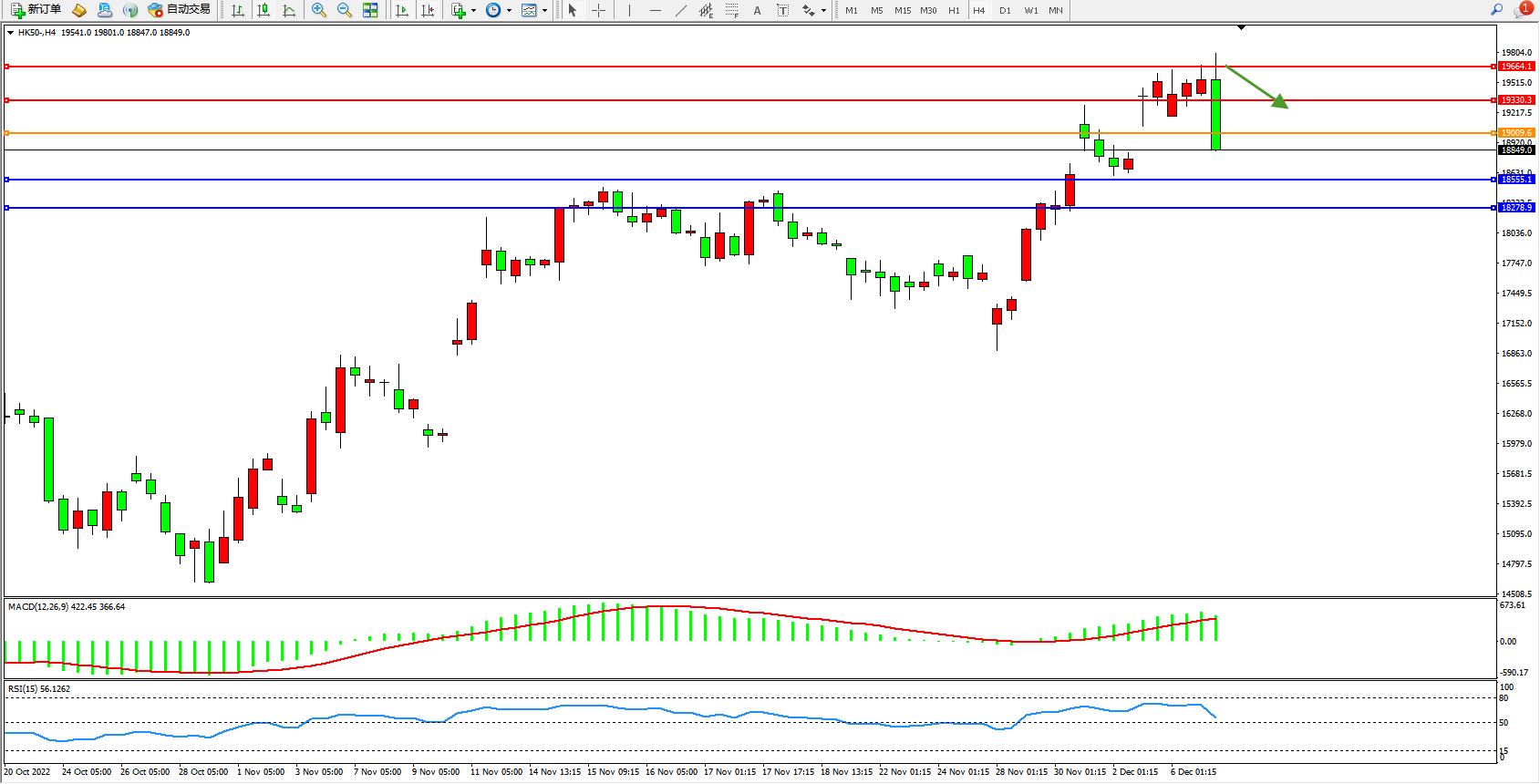 香港恒生指数12月7日(周三)收盘下跌626.36点,跌幅3.22%,报18814.82点;港股三大指数早盘维持震荡,午后防疫“新十条”发布,三大指数短暂冲高后持续下跌,恒生科技指数一度跌至4%,收跌3.77%险守4000点大关,恒指、国指分别跌3.22%和3.31%,恒指失守19000点。航空股午后回落但仍维持上涨行情,中医药股、医美概念股多数走强。南下资金全日净流出17.75亿港元,大市成交额为2074亿港元。