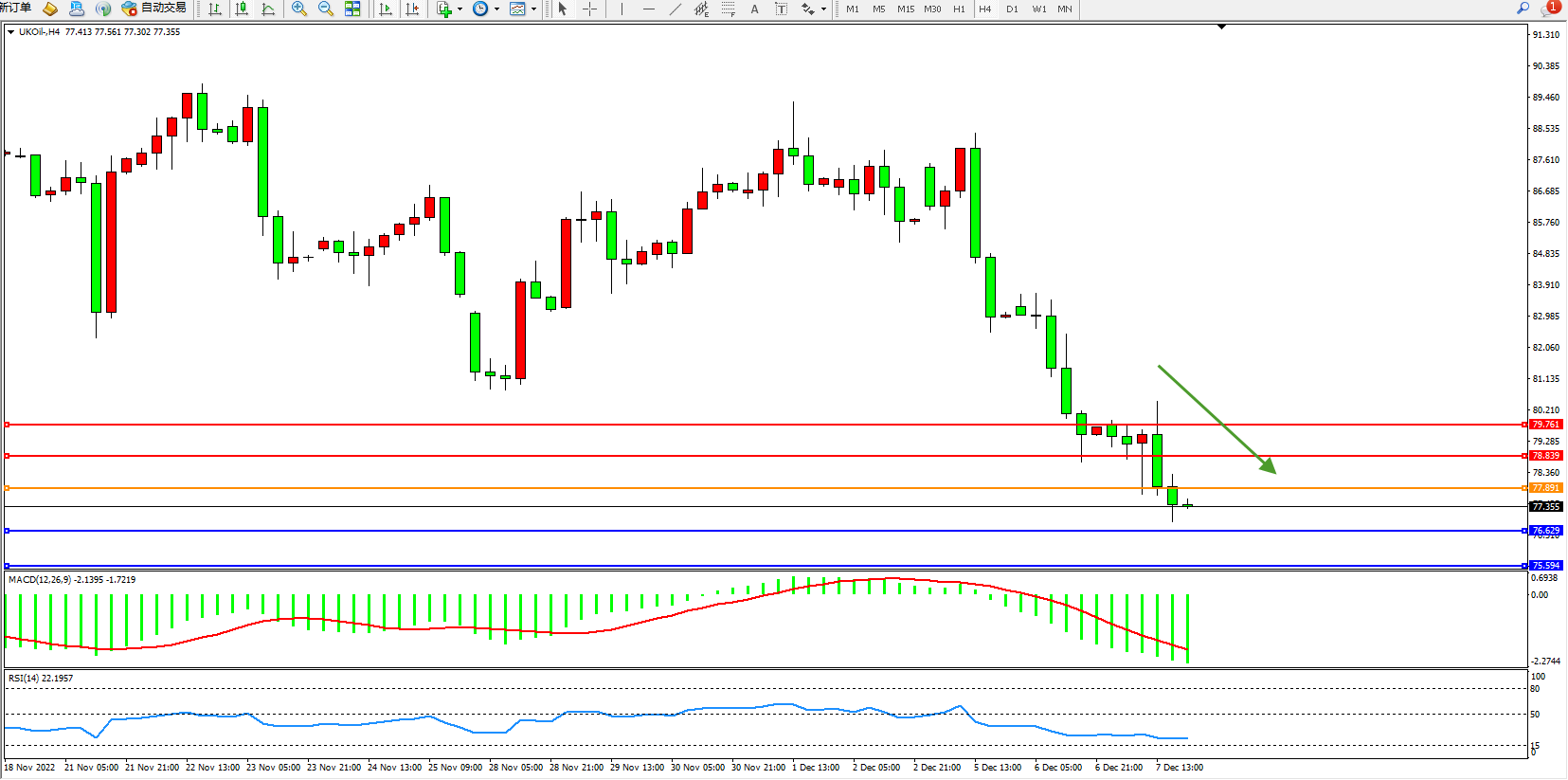 4小时图看:低位空头动力维持震荡下行,短期跌势或将 延续,市场整体空头态势良好,MACD指标处于空头区域低位下行,RSI指标处于空头区域低位弱势徘徊;