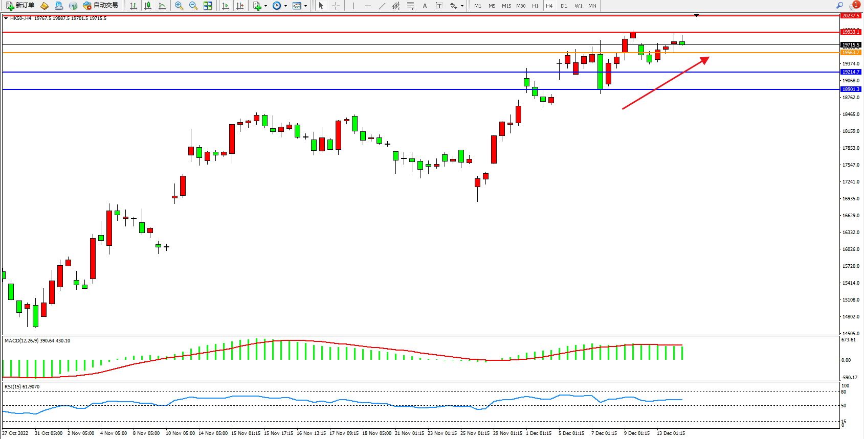 香港恒生指数12月14日(周三)收盘上涨77.25点,涨幅0.39%,报19673.45点;市场静待美联储利率决议,港股三大指数震荡收涨,国指涨0.71%,恒生科技指数涨0.34%,三者早盘曾转跌,大型科技股普遍上涨,百度涨3.59%,百度、美团、腾讯涨超2%;互联网医疗股大跌居前,半导体股高开低走,华虹半导体下跌超10%几乎抹平昨日涨幅,餐饮股、猪肉概念股、汽车股全天表现萎靡。南下资金净流入9.26亿港元,大市成交额为1363亿港元。