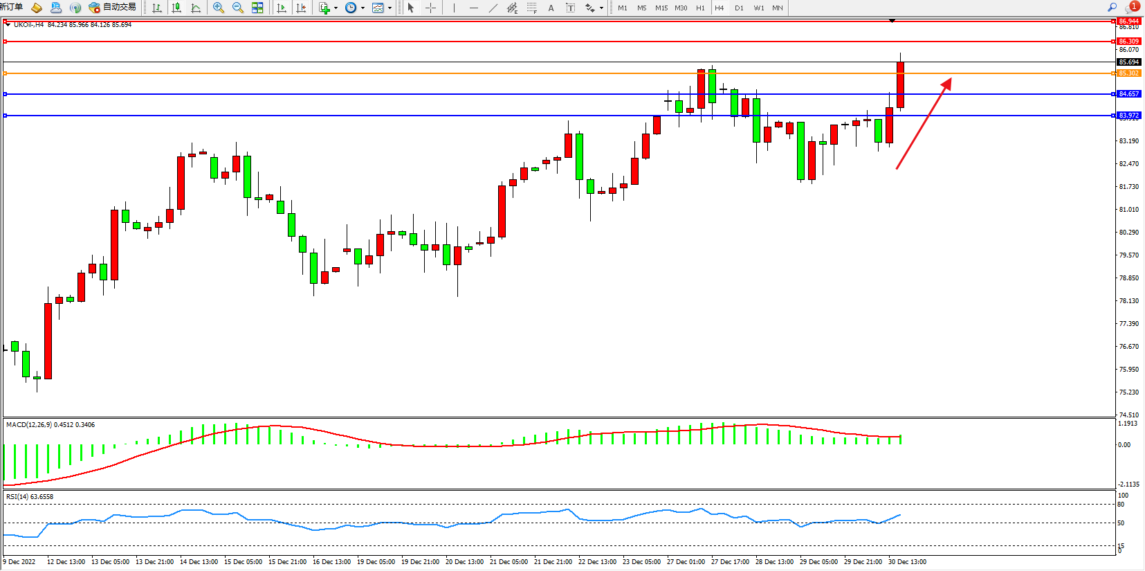 4小时图看:高位多头动力维持震荡后急速上扬,短期突破此前高位后有继续向上移动迹象,MACD指标处于0轴线上側弱势徘徊,RSI指标处于50均衡线上側弱势整理;
