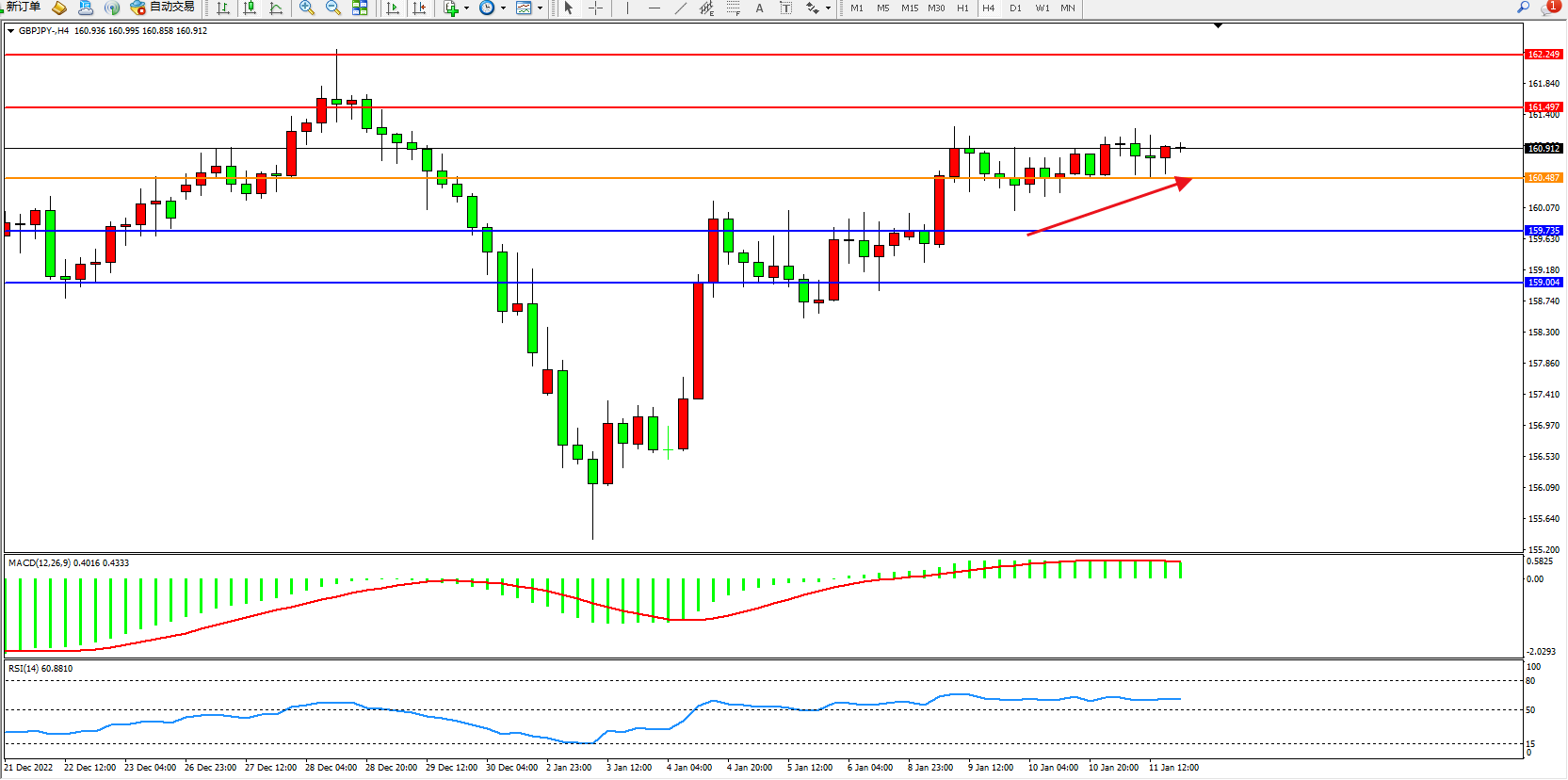 4小时图看:高位窄幅震荡,市场上行趋势依旧,MACD指标处于多头区域整理,RSI指标处于多头区域窄幅徘徊;