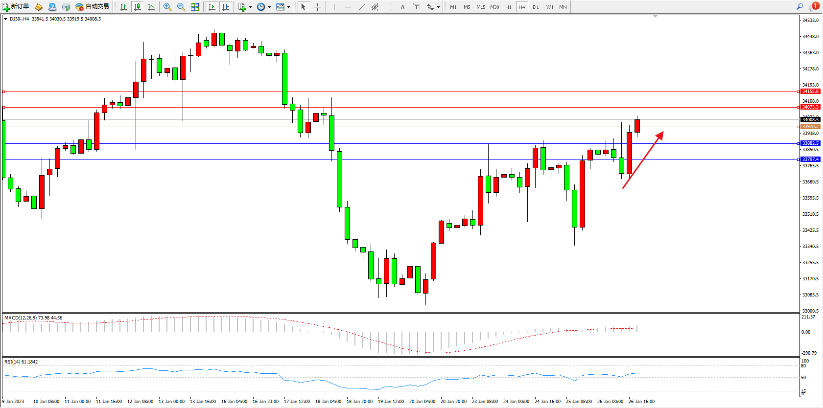道琼斯指数1月26日(周四)收盘上涨205点,涨幅0.61%,报33949.41点。美国GDP数据公布后,美联储利率预期没有太大变化。掉期交易显示,下周FOMC会议加息25个基点仍是板上钉钉的事。市场预期未来两次会议将加息47个基点,预计6月政策利率峰值将在4.92%左右。