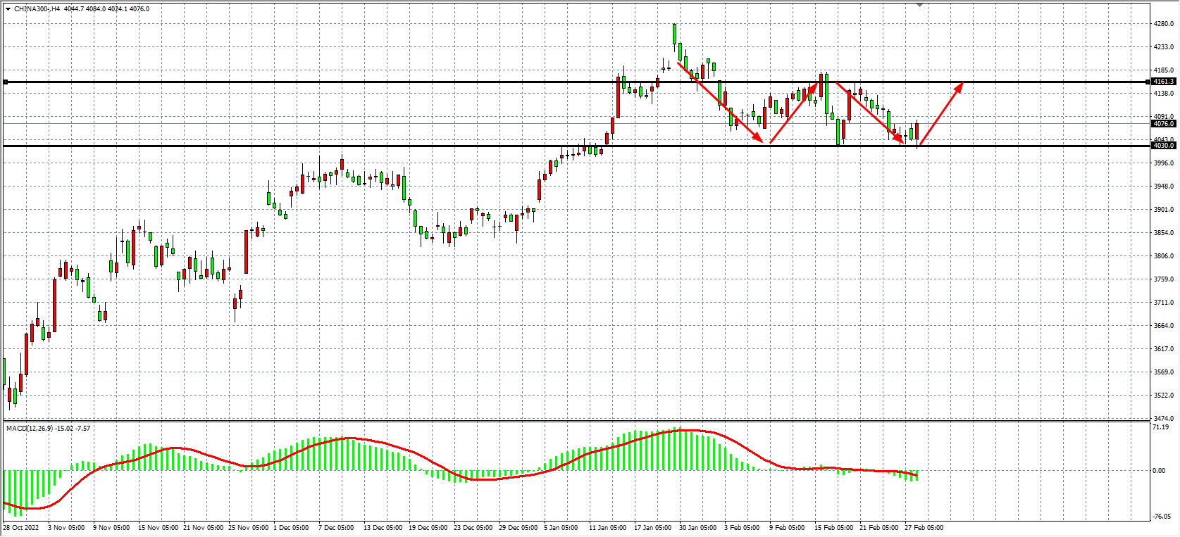 4小时图看,沪深300在4030附近支撑企稳后开启反弹,同时MACD于零轴之下出现缩量,当前支撑继续关注4030附近,该位之上看4120-4160-4200,下破看3980-3930。