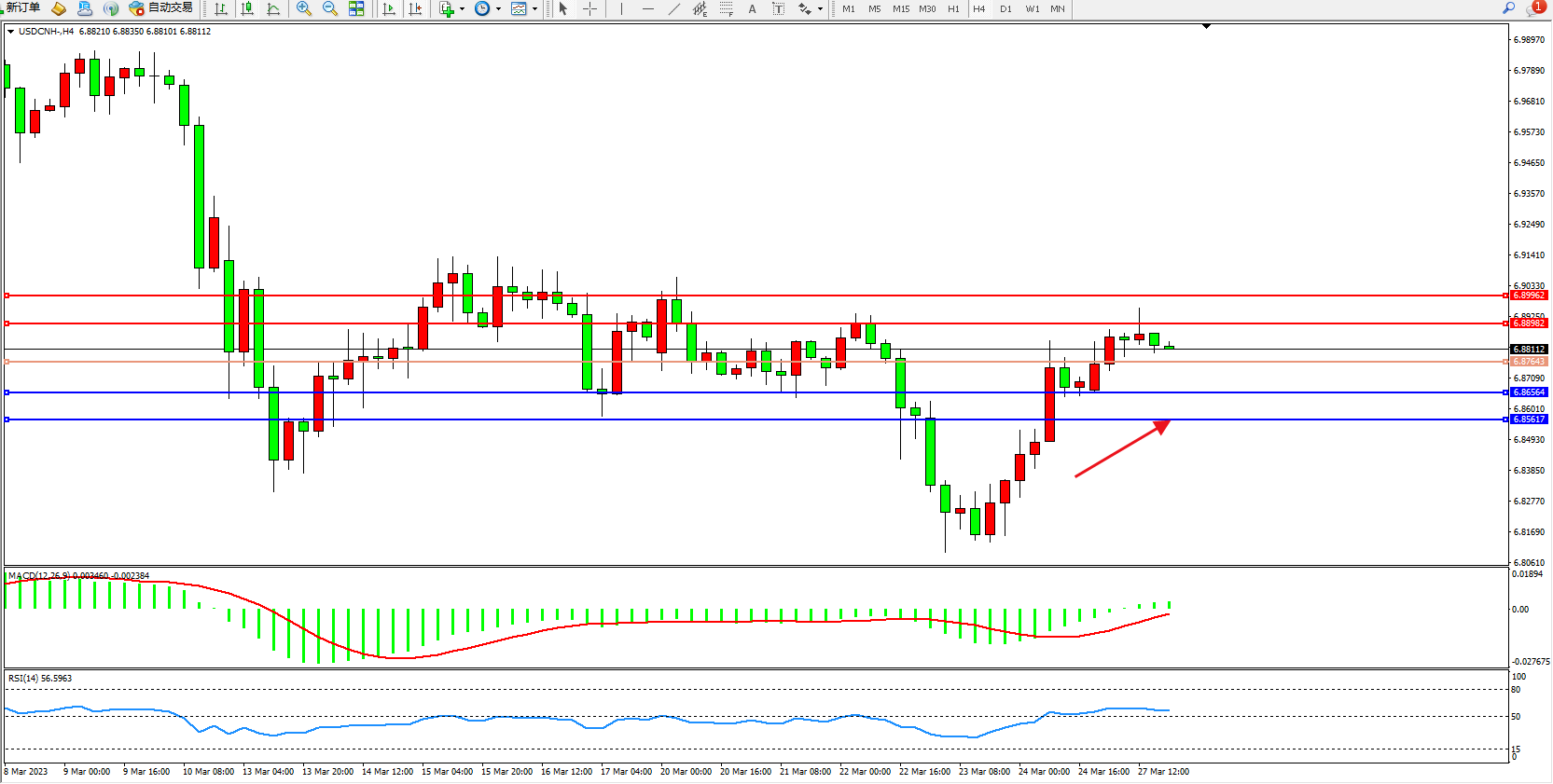 美元人民币USDCNH——4小时K线图显示: