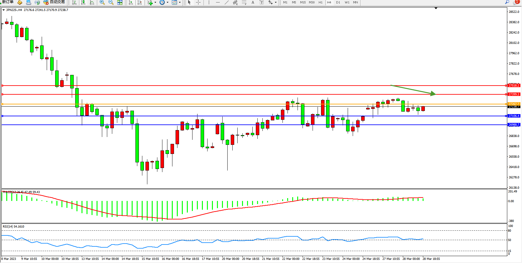 4小时图看:短期维持窄幅整理,市场多头动力均处于焦灼状态,MACD指标处于0轴线上側徘徊,RSI指标处于50均衡线上側整理;