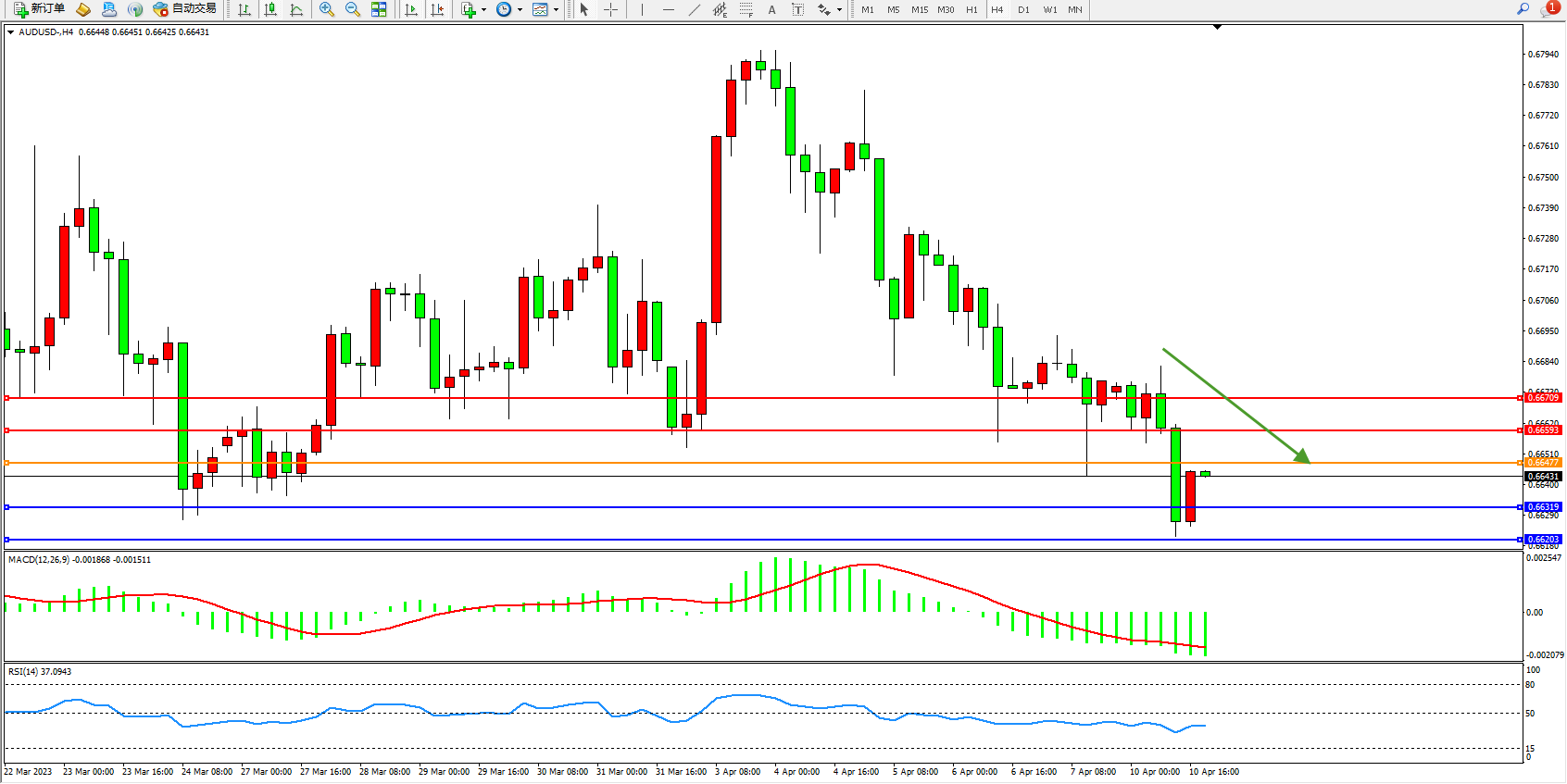 交易策略:0.66477下方看跌,目标0.66593  0.66709