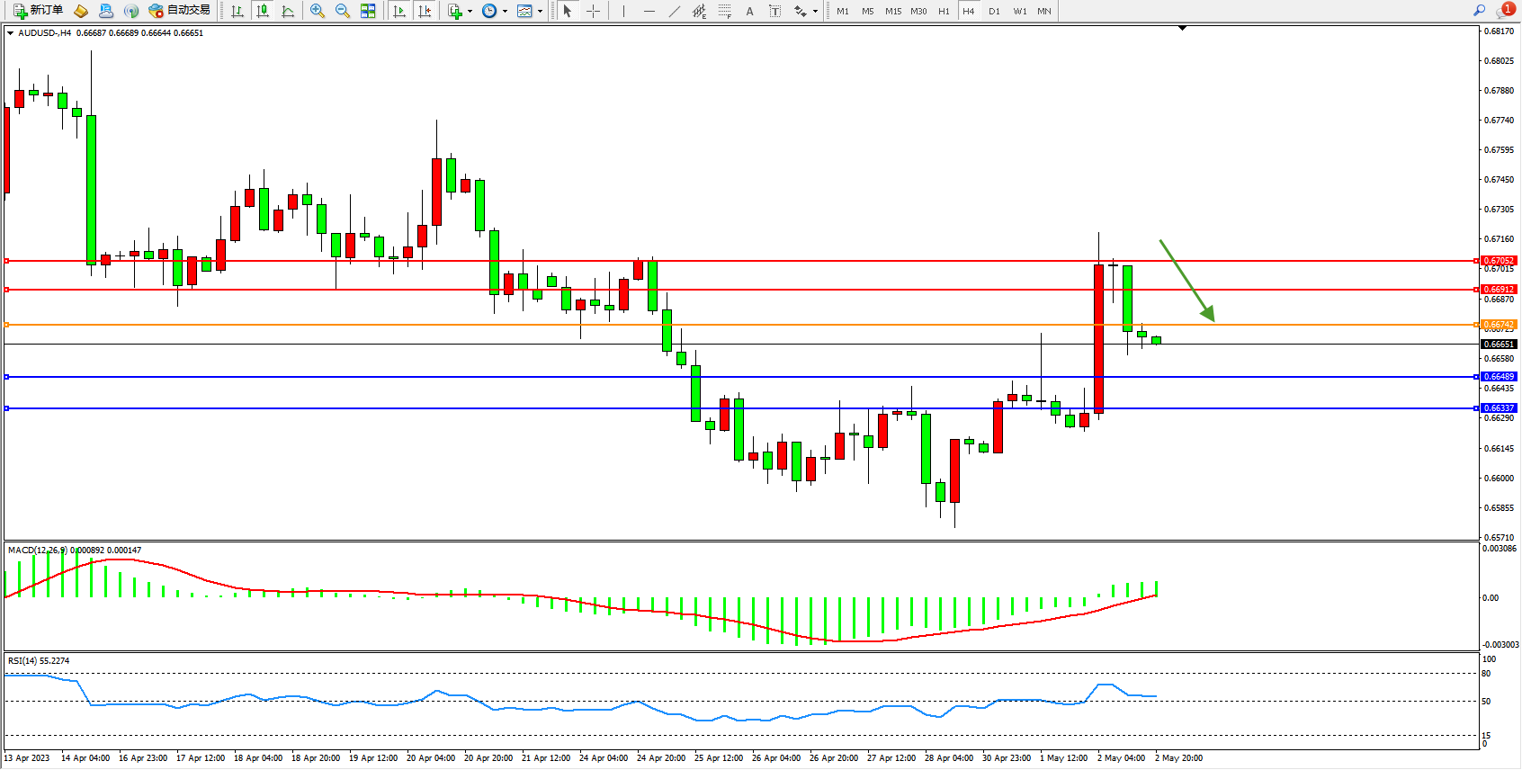 澳元兑美元维持0.66651附近震荡,澳大利亚至5月2日澳洲联储利率决定 3.85%,预期3.60%,前值3.60%。澳洲联储意外将基准利率上调25个基点至3.85%,续刷2012年以来新高,市场预期维持利率不变。