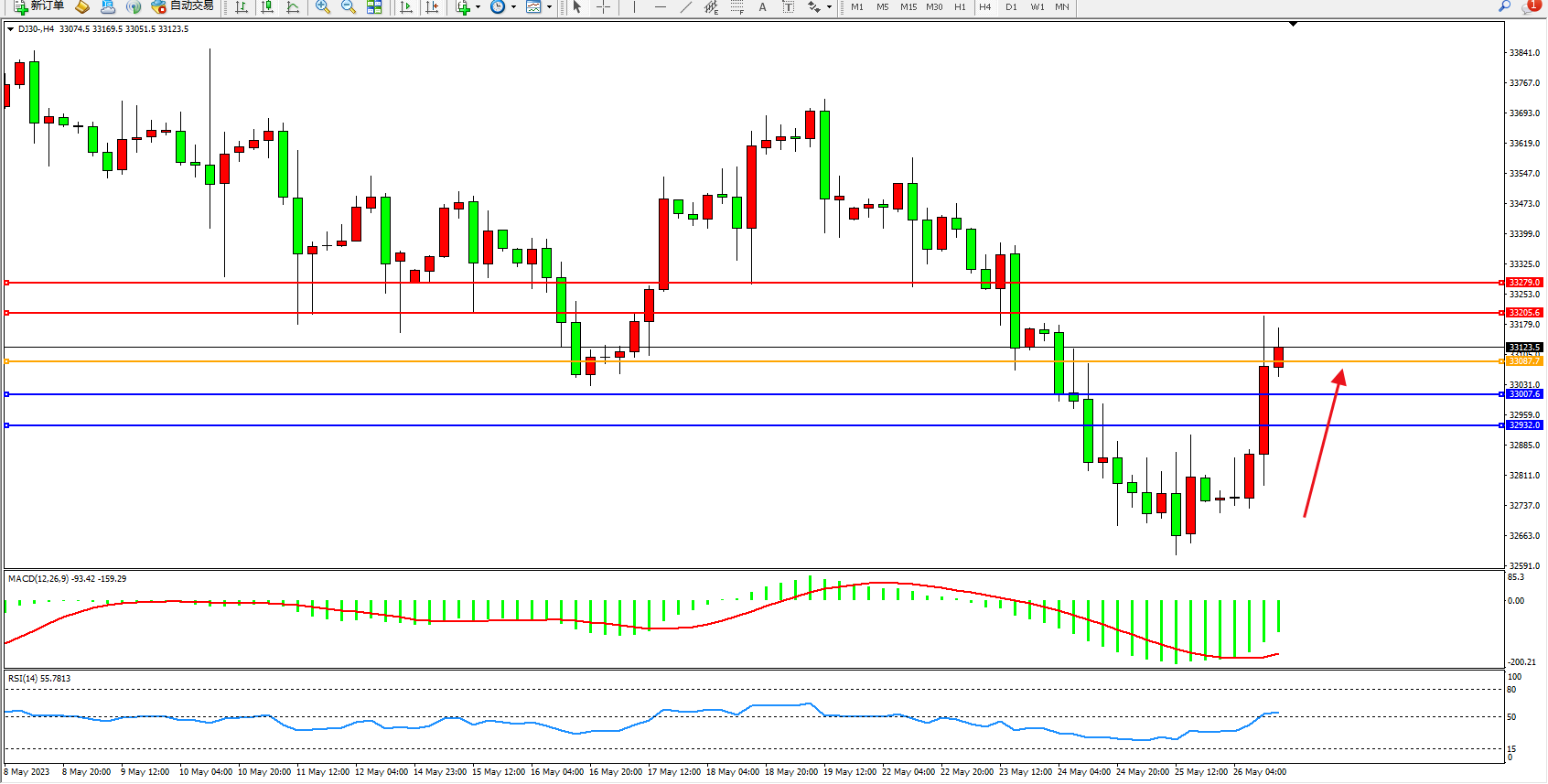 道琼斯指数5月26日(周五)收盘上涨328.69点,涨幅1.00%,报33093.34点;美国经济数据显示美联储未来可能还会进一步加息,其影响超过了债务上限谈判取得进展的迹象,美股股指期货因此抹去部分涨幅。