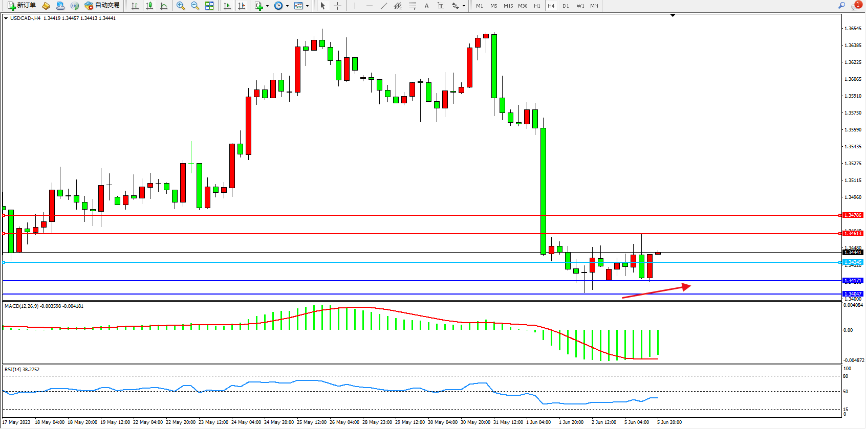 4小时图看:短期低位窄幅整理,市场整体跌势减弱,市场有多头动力伺机涌现迹象,MACD指标处于空头区域徘徊,RSI指标处于空头区域缓慢整理;
