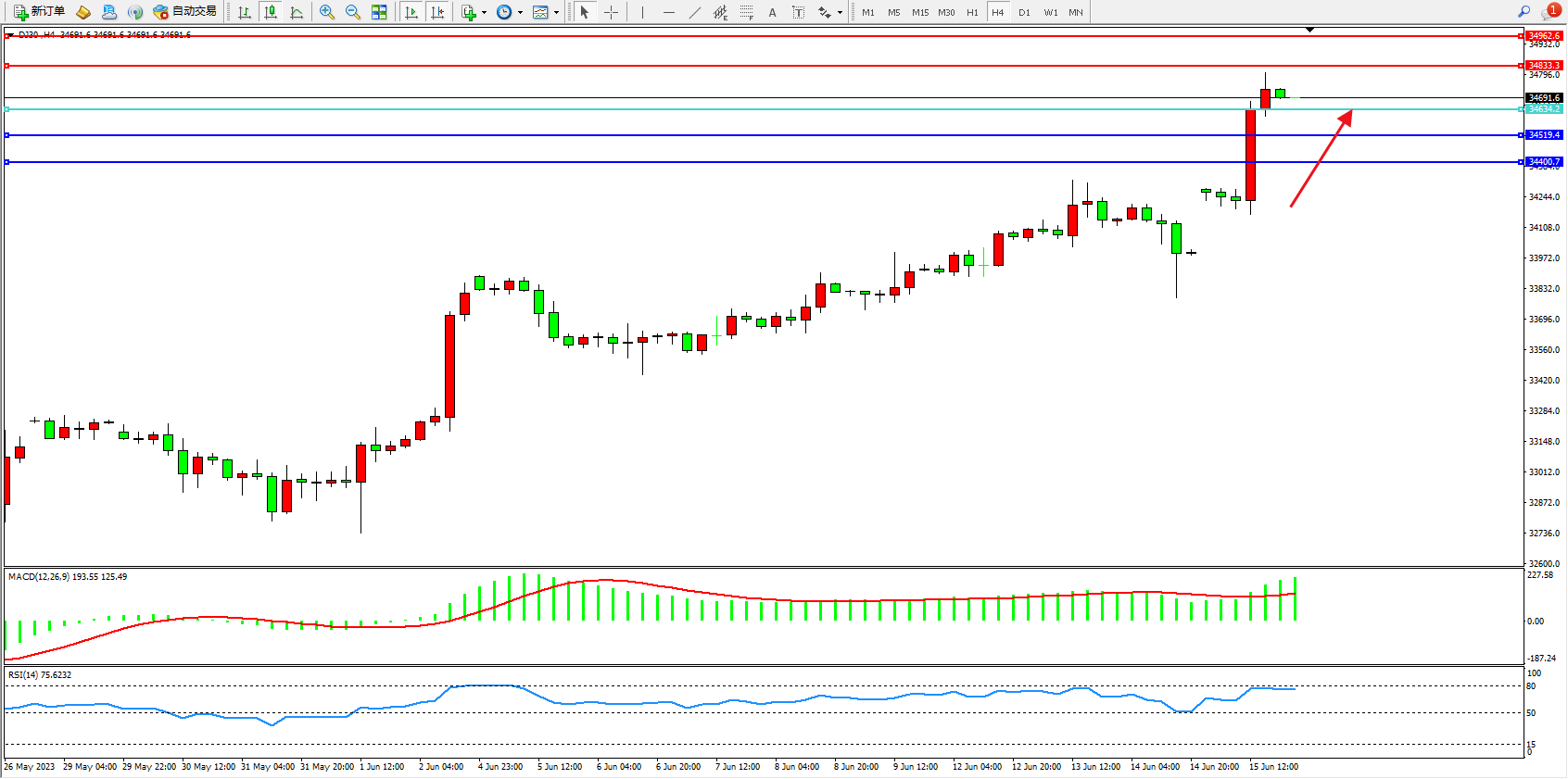 4小时图看:高位多头动力强势上扬,市场看涨情绪依旧,短期有继续向上移动态势,MACD指标处于多头区域高位上移,RSI指标处于多头区域高位整理;