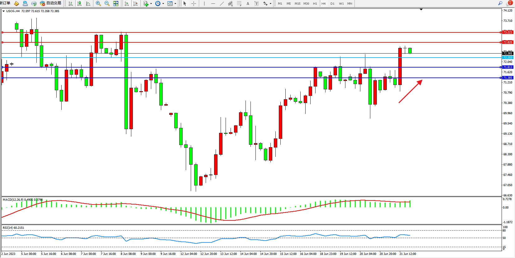 交易策略:72.203上方看涨,目标72.820  73.223