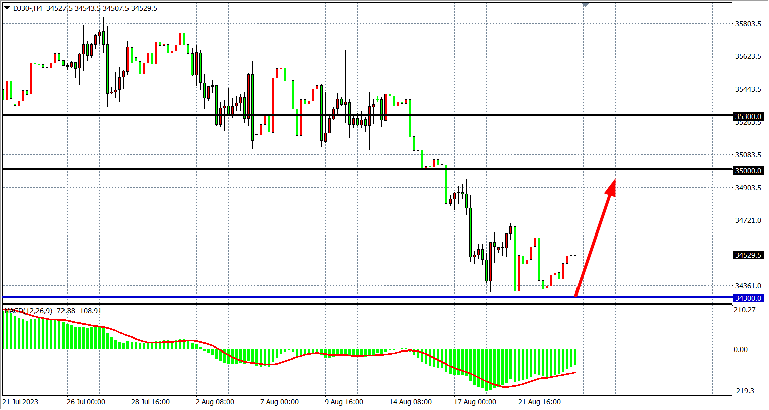 4小时图看,道指再度延续在34300之上震荡运营,MACD维持在零轴下,行情出现短暂支撑,关注下方34300一线,阻力依旧关注34780-35000。