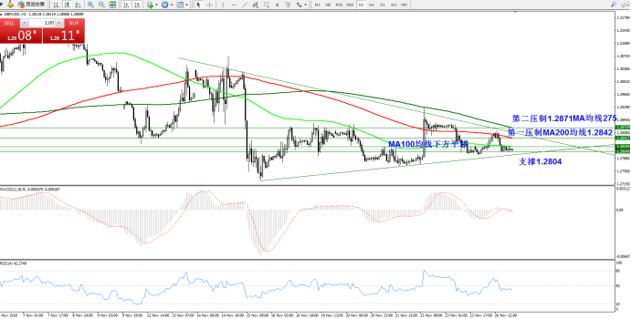 备选策略:三角形态走势收窄,底部支撑趋势线上移,关注1.2804附近节点,英国议会投票脱欧协议(1210日)之前考虑短线多单.