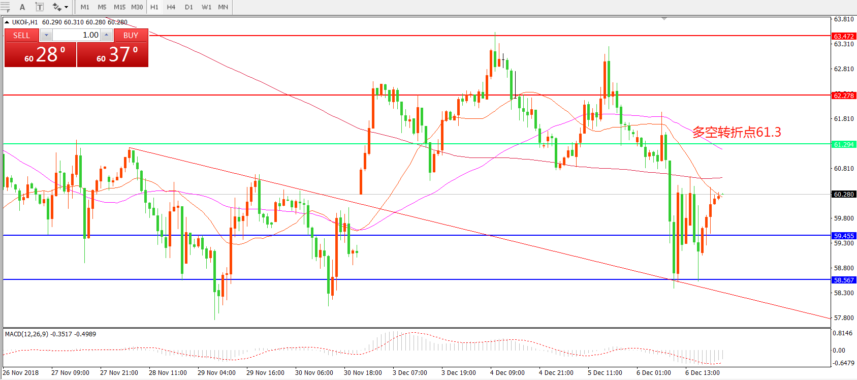 交易策略:在61.30之下看跌,目标60.00     58.00