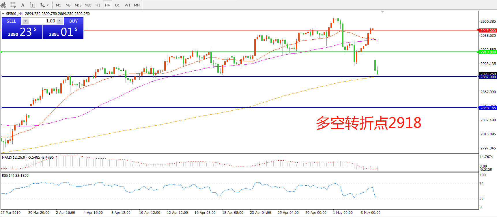 4小时图看,标普500大幅跳空低开,逼近下方2887支撑,200周期均线成为短期重要争夺点,MACD绿柱增加,红柱增加,RSI指标向下,短线重点关注2887一线得失。