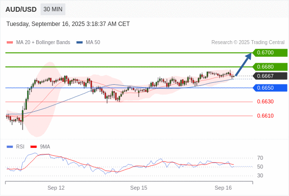 在 0.6650 之上,看涨,目标价位为 0.6680 ,然后为 0.6700 。