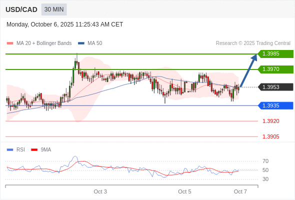 在 1.3935 之上,看涨,目标价位为 1.3970 ,然后为 1.3985 。