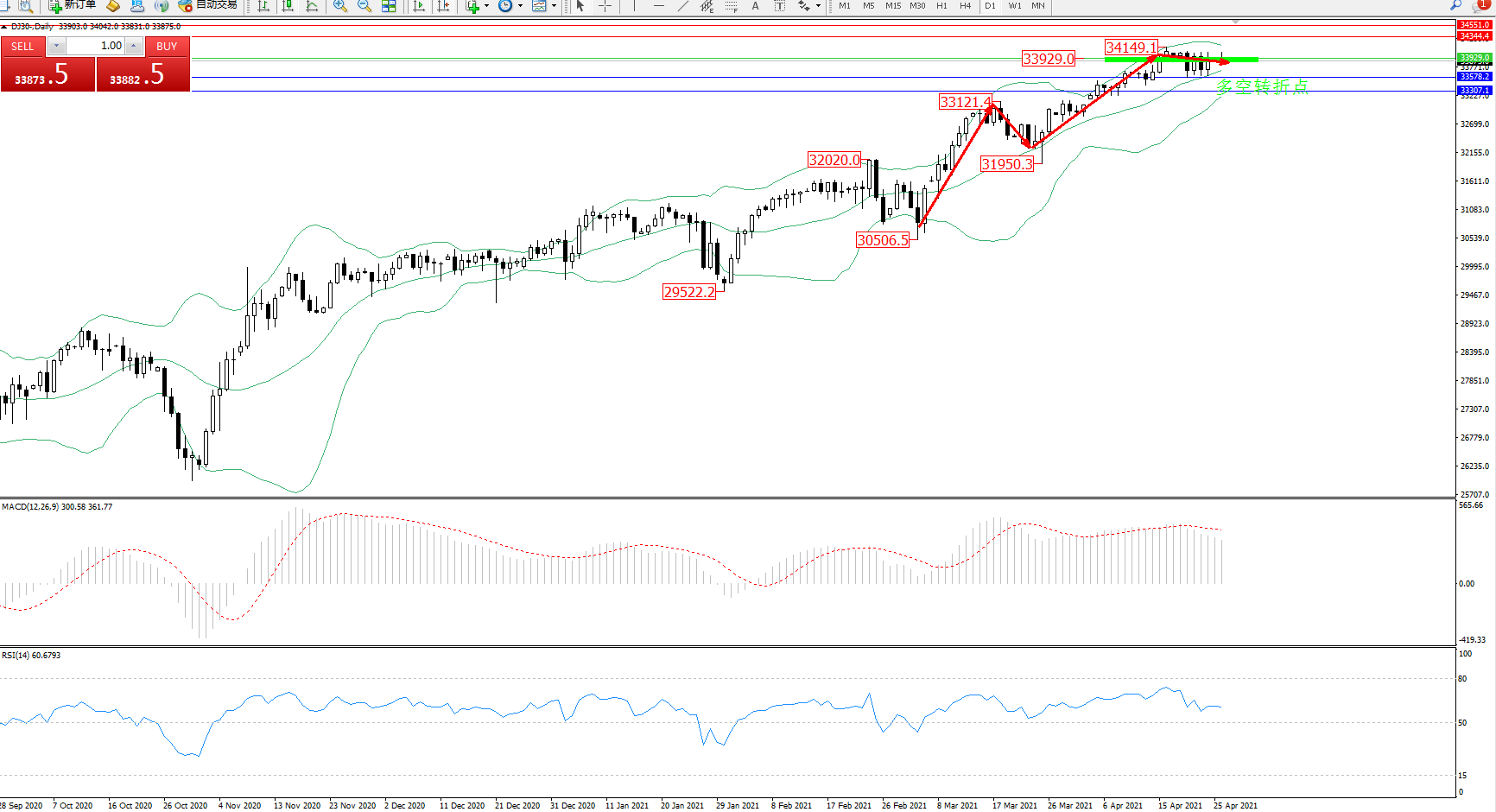 道琼斯指数4月26日(周一)收盘下跌61.52点,跌幅0.18%,报33981.97点;美股收盘,三大股指涨跌不一,道指高位弱势整理。强劲的公司业绩以及投资者对美联储保持宽松政策立场的信心;美国10年期国债收益率徘徊在50天移动均线附近。被视为经济增长晴雨表的铜飙升至十年来最高点;本周投资者将重点关注公司业绩以及美国经济数据,美联储定于周三结束的政策会议料不会调整宽松政策;尽管印度、巴西等新兴经济体不是面临新冠疫情飙升就是实施新的防疫措施,但发达经济体在疫苗接种加快的推动下正在走向更稳健复苏;美联储可能重申对货币政策将保持耐心,预测它们会承认近期经济数据的强势表现,也会继续强调目前较实现充分就业目标还有较长一段距离。认为它们会继续说服市场相信美联储的政策将在一段时间内保持相当的宽松。