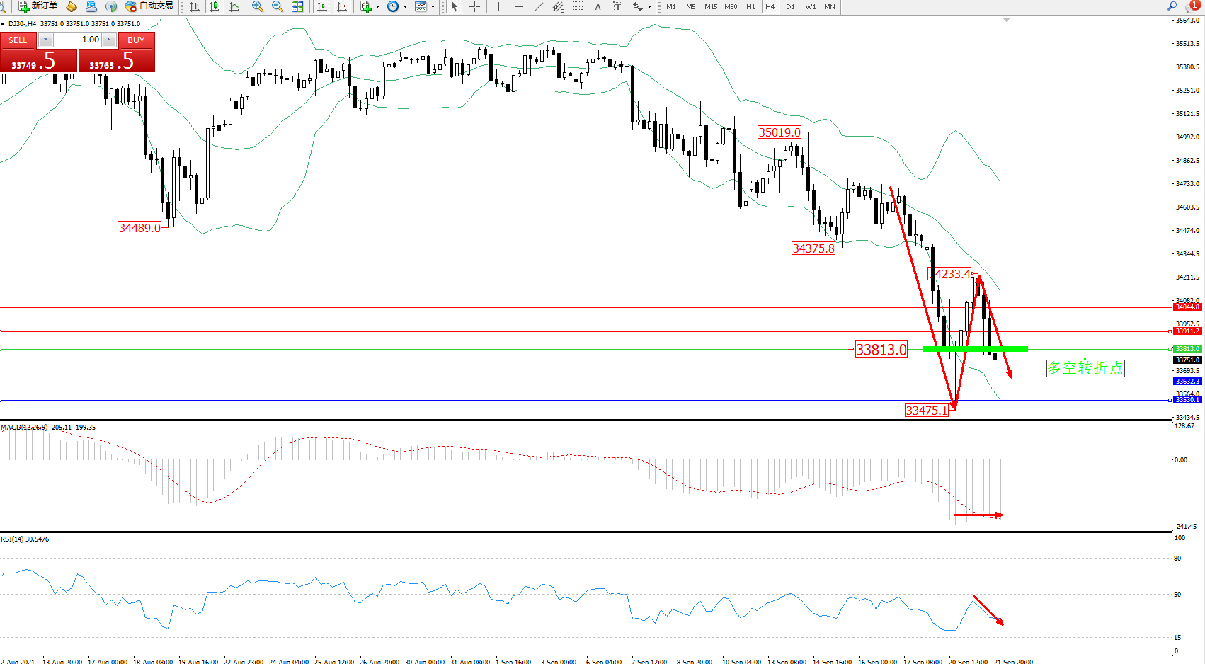 技术点评:空头动力延续布林带指标中下轨区间持续震荡下行,低位抵达33475位置后开始反转上移,高位遇阻后再度下探,短期维持弱势不断下行中,布林带指标呈收口下行走势持续中,MACD指标处于空头区域维持整理平移,RSI指标处于空头区域持续震荡向下移动;