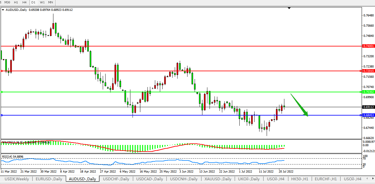 备选策略:0.7030上方看涨,目标0.7200、0.7400