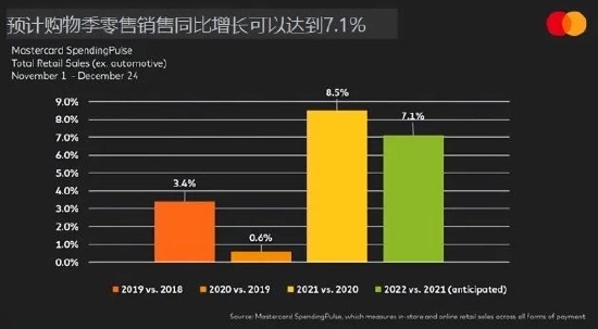 来自万事达的预测则较为乐观,预计美国购物季零售销售按年增长可以达到7.1%,因新增就业、工资上涨和储蓄持续增加,预计会让许多消费者准备好并有能力消费。