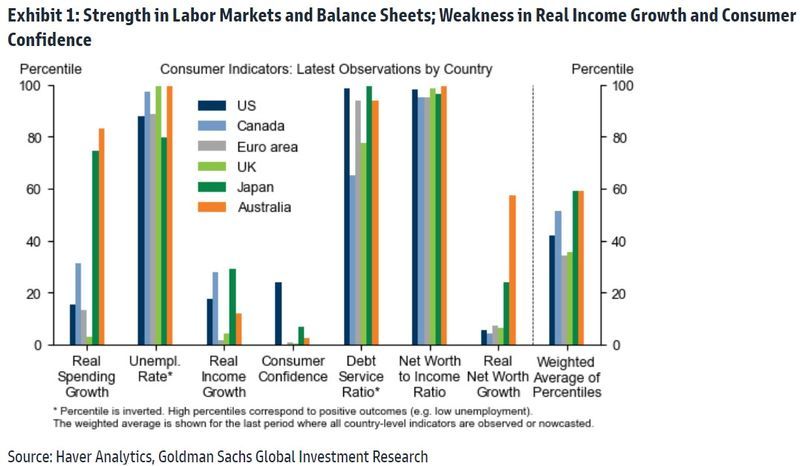 以Jan Hatzius为首的高盛分析师使用的一项衡量消费者健康状况的指标显示,这两个亚太地区国家的消费者健康水平在60%左右,而美国和欧元(1.0027, 0.0002, 0.02%)区分别在40%和35%左右。