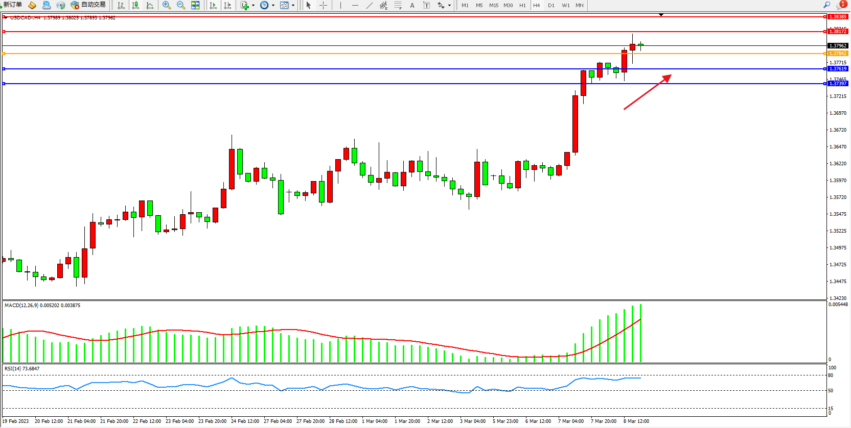 4小时图看:高位持续震荡上扬,短期看涨情绪笼罩, 市场多头不断向上移动中,MACD指标处于多头区域高位上扬,RSI指标处于多头区域高位弱势徘徊;