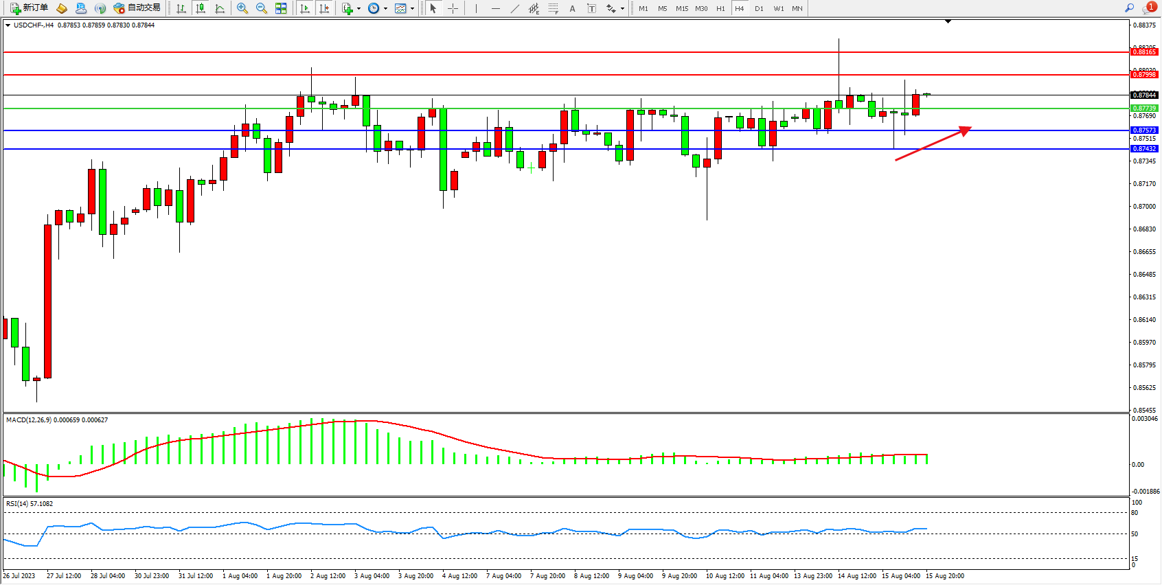 4小时图看:高位短期维持整理,市场多头情绪徘徊,MACD指标处于0轴线上側弱势整理,RSI指标处于50均衡线上側徘徊;
